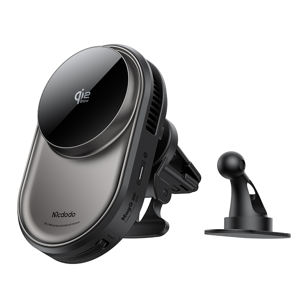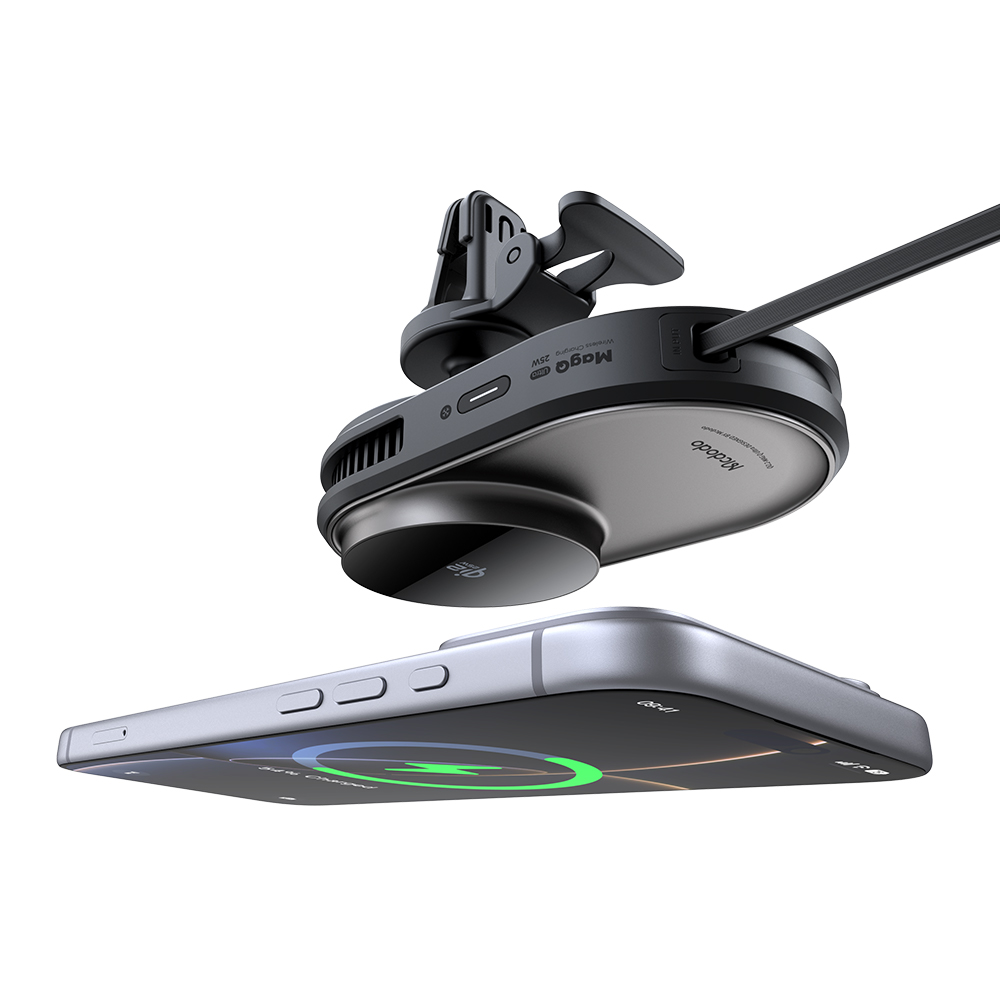 The wireless car charger is Qi2.2 25W certified, TEC-cooled, and has built-in retractable cable.